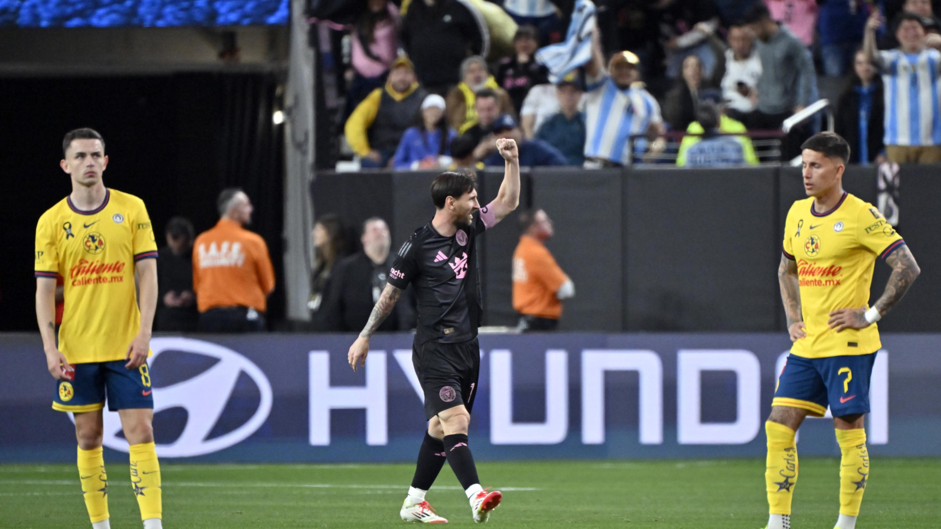 Ante la presión ejercida por la afición americanista, Lionel Messi no dejó pasar el momento y se enganchó con los seguidores, a quienes volteó a ver, les enseñó el apellido en el reverso de su camiseta y les presumió las tres Copas del Mundo conseguidas por la ‘albiceleste’; añadió que México no ha conseguido ningún título, haciendo una seña del número cero.